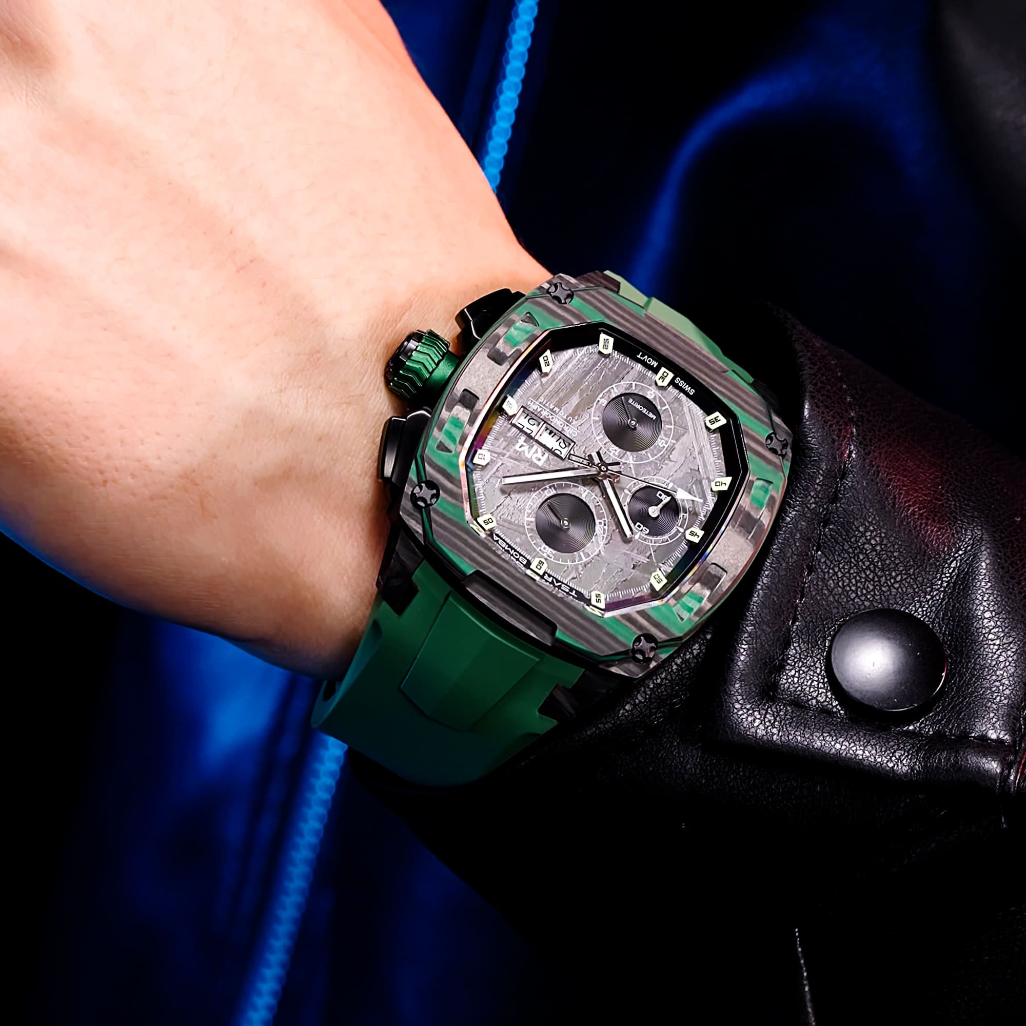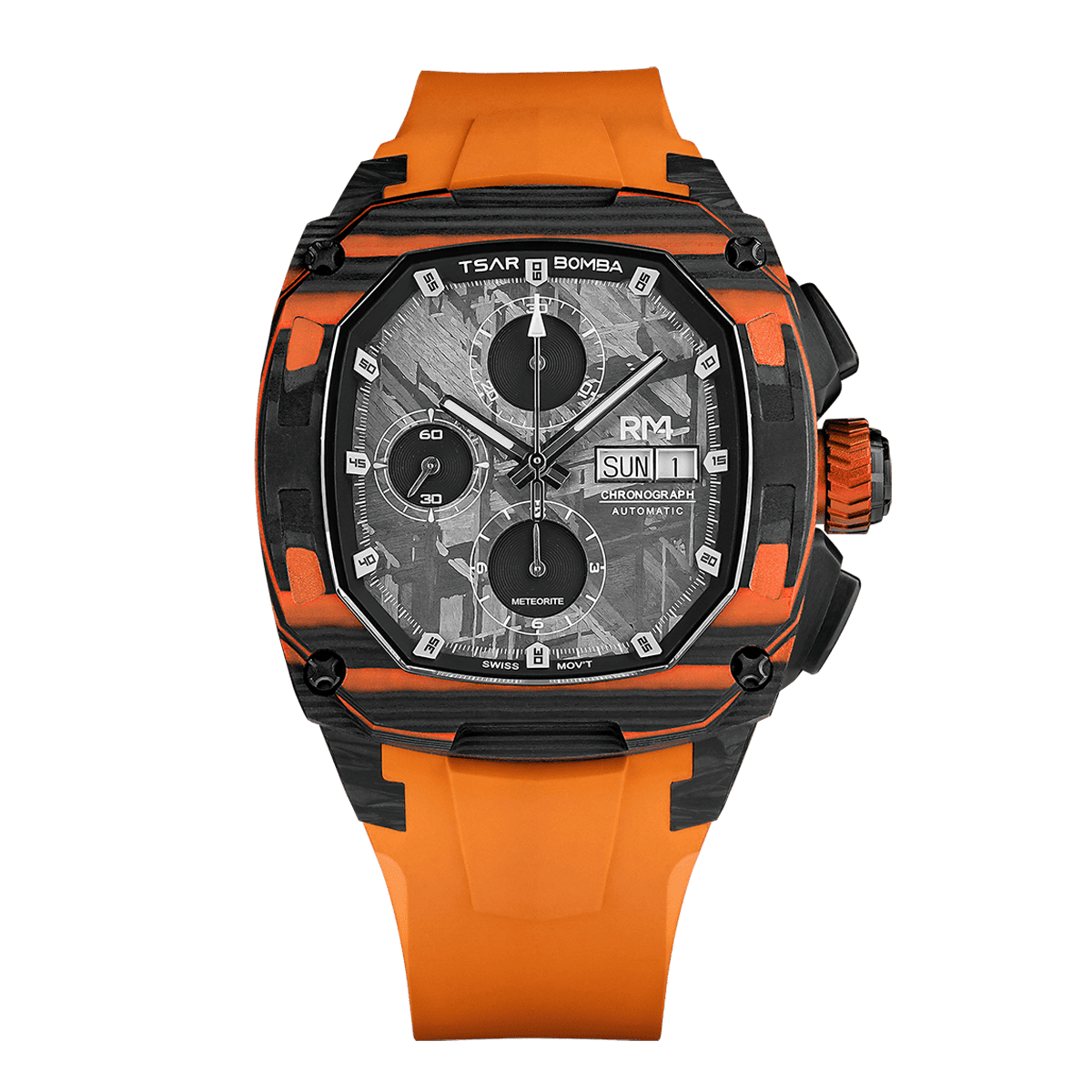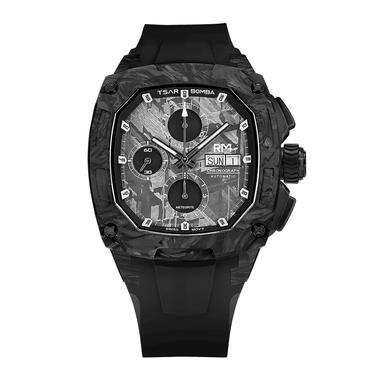 Esfera de meteorito: forjada a partir de meteorito auténtico, cada esfera es única. Combinada con tres subesferas de cronógrafo y una ventana de fecha, fusiona la rareza cósmica con la refinada artesanía relojera.