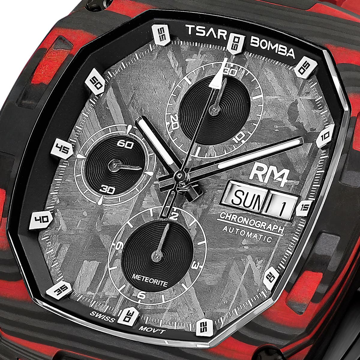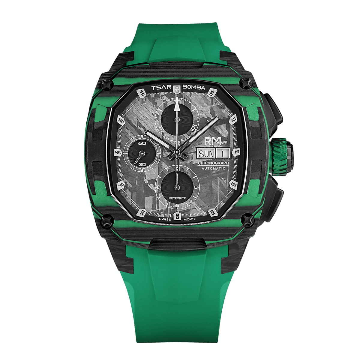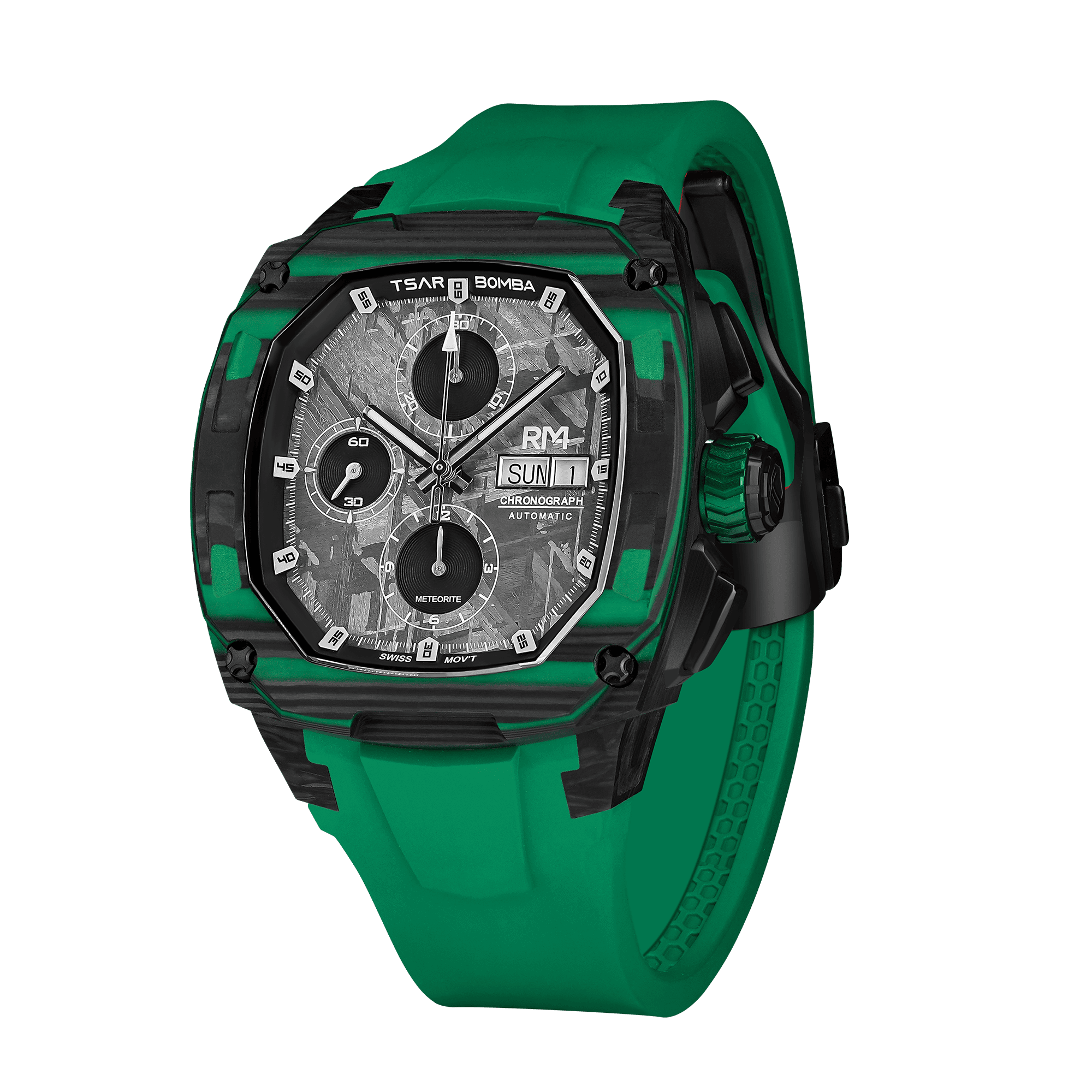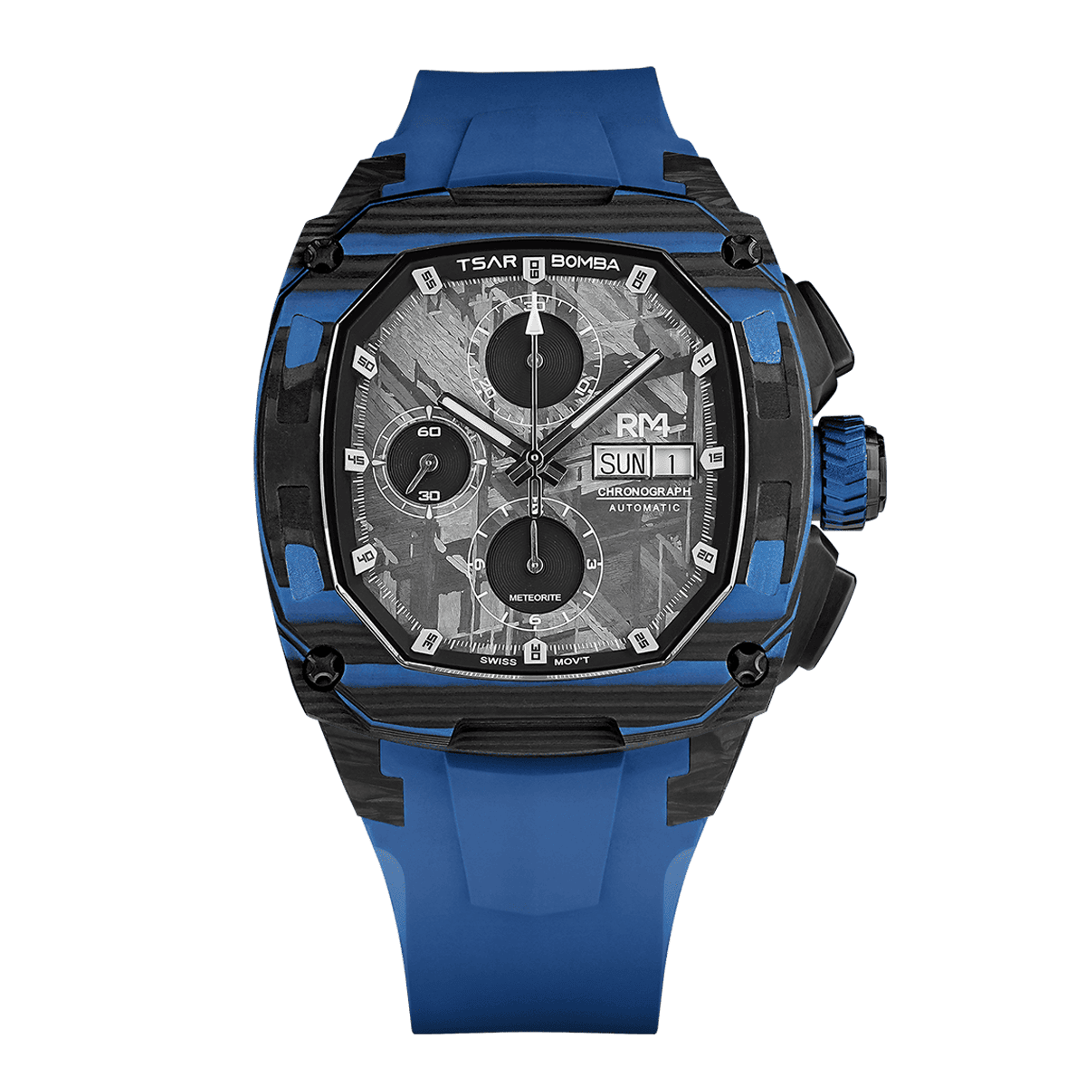 Esfera de meteorito: forjada a partir de meteorito auténtico, cada esfera es única. Combinada con tres subesferas de cronógrafo y una ventana de fecha, fusiona la rareza cósmica con la refinada artesanía relojera.